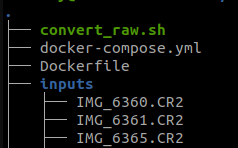 ENTRYPOINT ["/app/convert_raw.sh"]Then even though it is a single container application, I still like to make a docker-compose.yml as a way of documenting all the runtime options passed. In this case it's really just the input/output directories, and the script itself. I like to mount my working script into the container at runtime so I can modify it without having to constantly rebuild the image. This pattern works well in development or ad-hoc situations like this