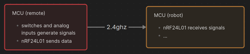 This is the simplest to understand, just think of a "remote control" car or airplane. The robot and the transmitter are two components, each equally uncomplicated. The transmitter sends signals, the robot receives signals and translates them to physical actions like driving.