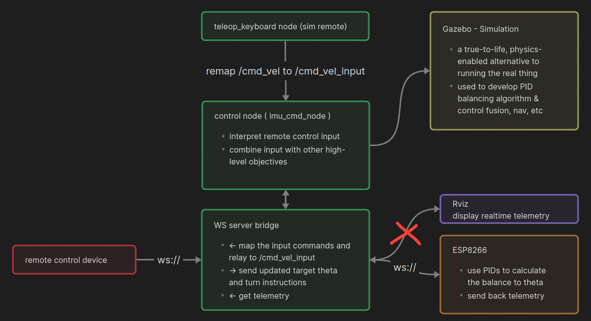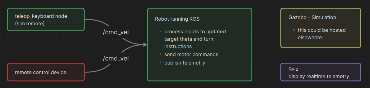 In development / simulation it has been convenient to use the keyboard as my "controller" ( the teleop_keyboard node ) and the Gazebo simulation as my "robot". In a real scenario a better web-based control UI could be provided and the real robot hardware used. Being able to modularize and interface these parts is another benefit of organizing this using a framework.