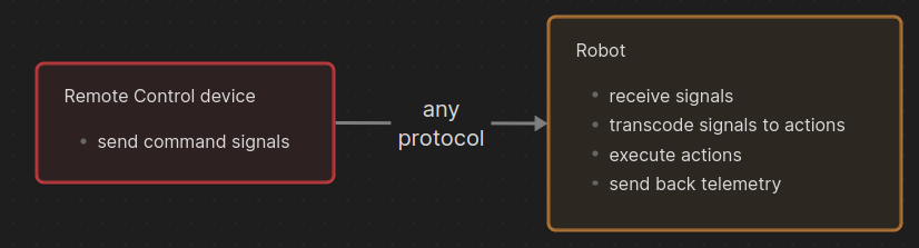 Or it can be a "soft remote", where a web app is used via a web browser and the instructions are relayed to the API exposed by the robot. If the robot provides the Wifi access point and self-hosts it's own remote control application then this is still a standalone system. So it requires slightly more capable hardware, but still just a point-to-point setup: